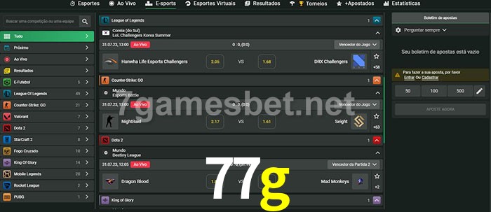 O 77g oferece uma grande seleção de opções de apostas em e-sports com probabilidades competitivas
